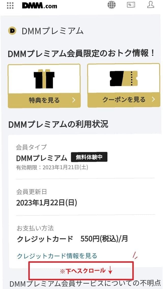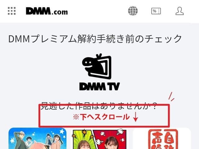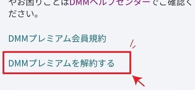 DMMプレミアムページの下の方にスクロールすると「DMMプレミアムを解約する」が表示されているのでタップします。