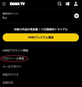 まずはじめに、ブラウザ上でDMMTVの右上の人型を選択し、プロフィール管理を開きます。