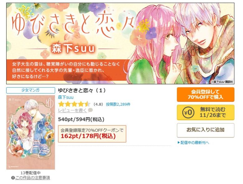 『ゆびさきと恋々』は、2025年現在 コミックシーモアで期間限定 “2巻無料” の超大型キャンペーン中です。