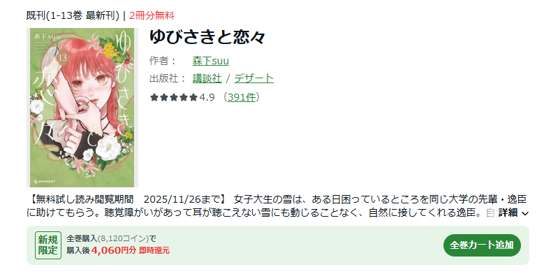 例えば、ゆびさきと恋々13巻の場合は4,060円割引(8,120円→4,060円)と超お得に!!(※以下画像は50%OFFが適応されている13巻までの値段)